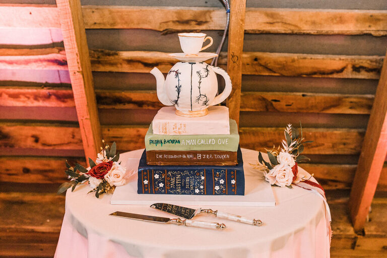 Katy and Dave’s early October wedding came with all the storybook details, even a passing hurricane! Despite the weather, no detail was forgotten on their beautiful day and each element helped create the perfect English literature and tea party inspired theme for their wedding. Their cake was truly a piece of art for these book lovers!